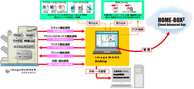 imageWARE Desktopは、imageRUNNER ADVANCEと連携することで、オフィスにおけるドキュメント業務の生産性向上とコスト削減を可能にするPC アプリケーションです。